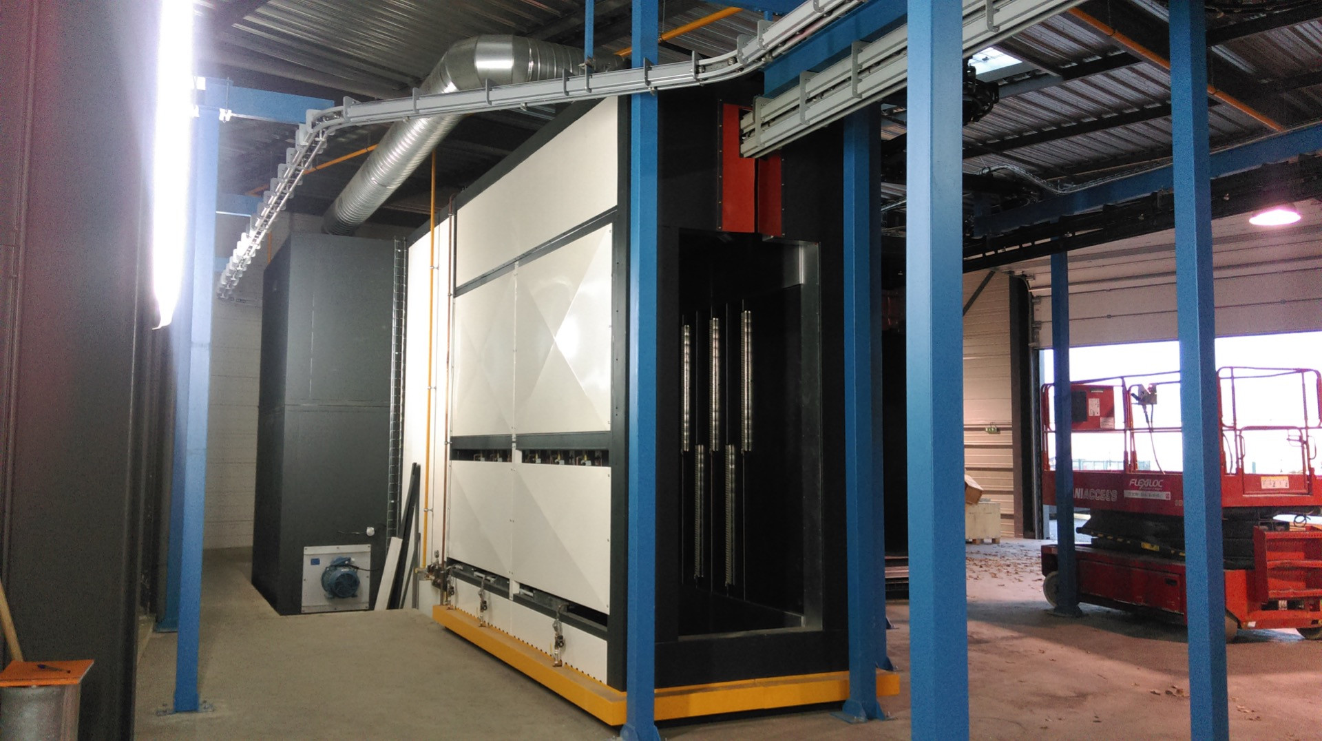 Pour un sous-traitant en peinture poudre, cette installation de poudrage permet de traiter des pièces de 6.5m et des poids jusqu’à 500kg maxi. Elle se décompose d’une cabine de poudrage automatique avec robots de peinture avec cyclone de récupération des poudres et groupe dépoussiéreur, d’un infrarouge, d’un four de cuisson 200°C et d’un convoyeur motorisé aérien double voies.
